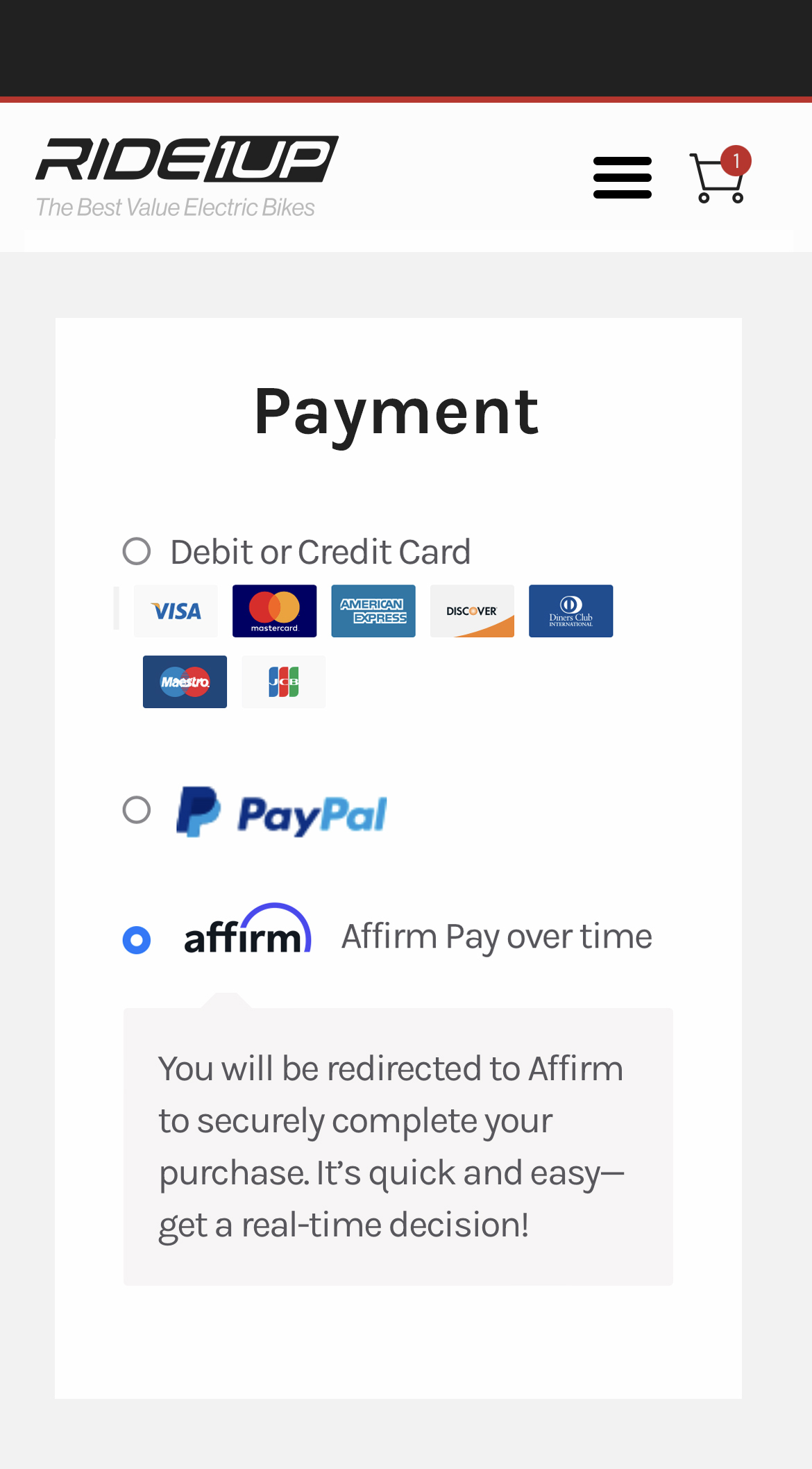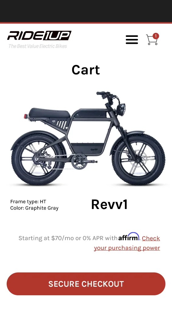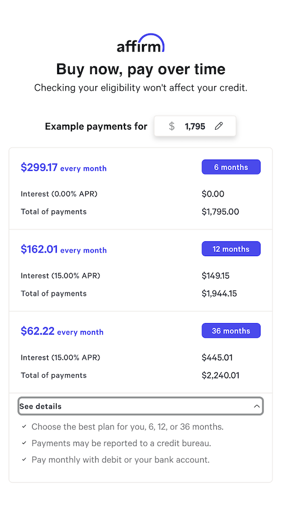 Your rate will be 0-36% APR based on credit, and is subject to an eligibility check. For example, a $2,395 ebike might cost $85/mo over 36 months at 15% APR. Payment options through Affirm are provided by these lending partners: affirm.com/lenders. Options depend on your purchase amount, and a down payment may be required. CA residents: Loans by Affirm Loan Services, LLC are made or arranged pursuant to California Finance Lenders Law license.